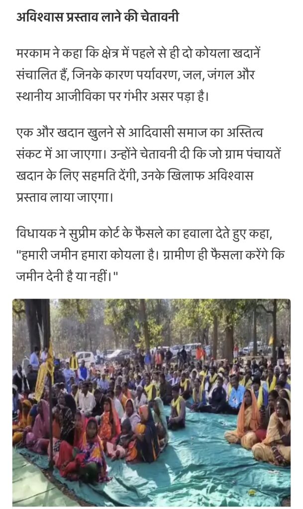 विधायक तुलेश्वर सिंह मरकाम ने आरोप लगाया कि प्रशासन द्वारा लगभग चार प्रभावित ग्राम पंचायतों के सरपंचों और सचिवों पर दबाव बनाकर जबरन प्रस्ताव लिए जा रहे हैं।